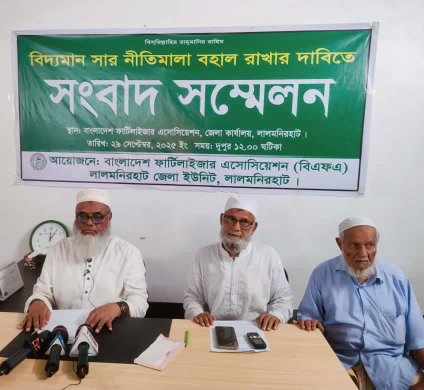 বিদ্যমান সার নীতিমালা বহাল রাখার দাবিতে সংবাদ সম্মেলন করেছেন বাংলাদেশ ফার্টিলাইজার এসোসিয়েশন লালমনিরহাট জেলা শাখা। সোমবার (২৯ সেপ্টেম্বর) দুপুরে জেলা শহরের এসোসিয়েশন কার্যালয়ের হলরুমে এ সংবাদ সম্মেলন অনুষ্ঠিত হয়।