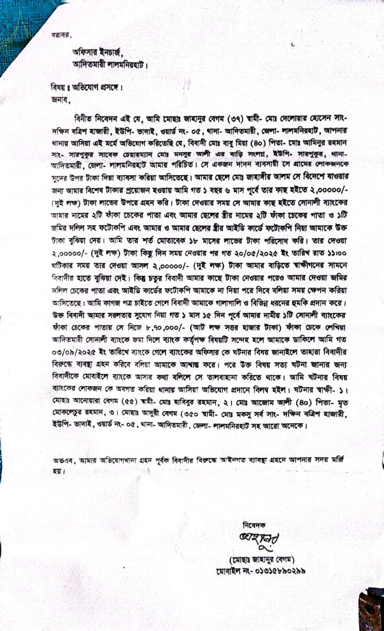 এদিকে ২০২৪ সালে একই উপজেলার ভাদাই ইউনিয়নের দক্ষিণ বত্রিশ হাজারী গ্রামের দোলোয়ার হোসেনের স্ত্রী জাহানুর বেগম তার ছেলে জাহাঙ্গীর আলমকে বিদেশ পাঠাতে দুই লক্ষ টাকার প্রয়োজন। তাই ১ বছর ৬ মাস পূর্বে আসাদুজ্জামান ওরফে বাবু’র সাথে জাহানুর বেগম তার নামীও সোনালী ব্যাংক, আদিতমারী শাখার ২টি ফাঁকা চেকের পাতা এবং তার ছেলের স্ত্রীর নামের ২টি ফাঁকা চেকের পাতা, জমির দলিল ও স্ট্যাম্পে স্বাক্ষর নিয়ে ২ লক্ষ টাকা দেন। যার বিপরীতে জাহানুর বেগমকে প্রতিমাসে ৩০ হাজার টাকা সুদ প্রদান করতে হবে।