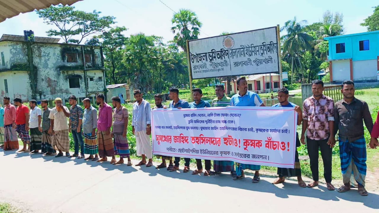 সাব্বির কাজী, রাঙ্গাবালী (পটুয়াখালী) প্রতিনিধি: ইউনিয়ন ভূমি উপসহকারী কর্মকর্তা (তহসিলদার) কাজী মো. জাহিদুল ইসলামের বিরুদ্ধে ঘুষ ও দুর্নীতির অভিযোগ এনে বিক্ষোভ ও মানববন্ধন করেছেন ভুক্তভোগী কৃষক ও এলাকাবাসী। রোববার (১২ অক্টোবর) দুপুরে উপজেলা সদরের বাহেরচর বাজার সংলগ্ন উপজেলা ও ইউনিয়ন ভূমি অফিসের সামনে এ মানববন্ধন অনুষ্ঠিত হয়।